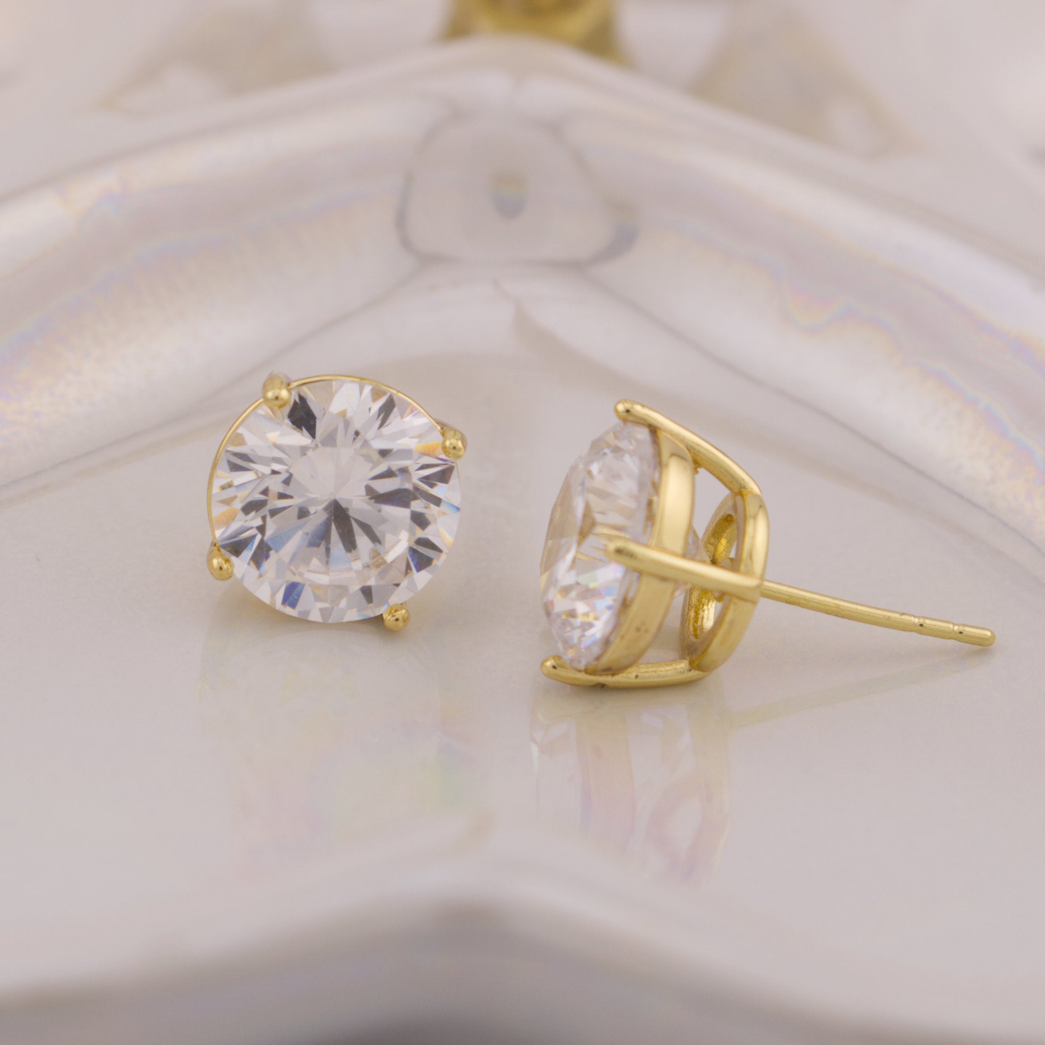 Atemporales y sofisticados, estos pendientes clásicos de solitario aportan un toque radiante a cualquier look. Cada pendiente presenta una brillante piedra de corte redondo engastada de forma segura en un engaste de cuatro puntas chapado en oro de 14 quilates, diseñado para maximizar el brillo y la elegancia. Perfectos para el uso diario o para ocasiones especiales, estos pendientes son un elemento básico versátil que toda colección de joyas necesita.