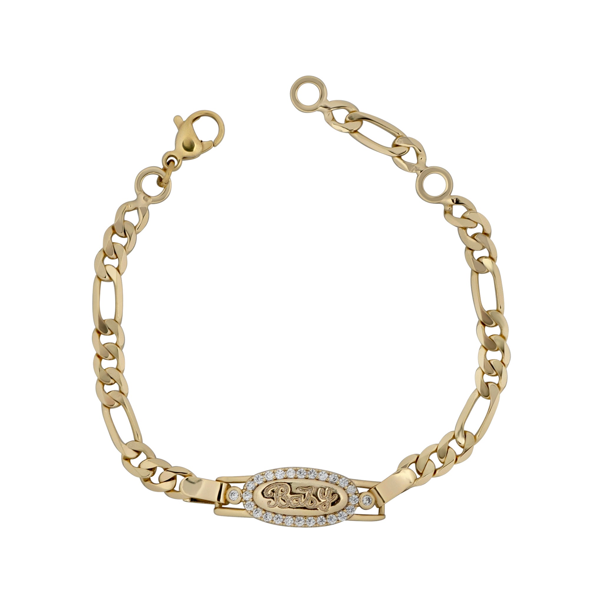 The Baby Gold ID Bracelet - 14K Gold-Plated is a charming piece designed with love for little ones. Its delicate Figaro-style chain and oval ID plate engraved with the word “Baby”, surrounded by shimmering cubic zirconia, create a sweet and timeless keepsake. Perfect as a baby gift or baptism accessory, combining elegance and sentiment.