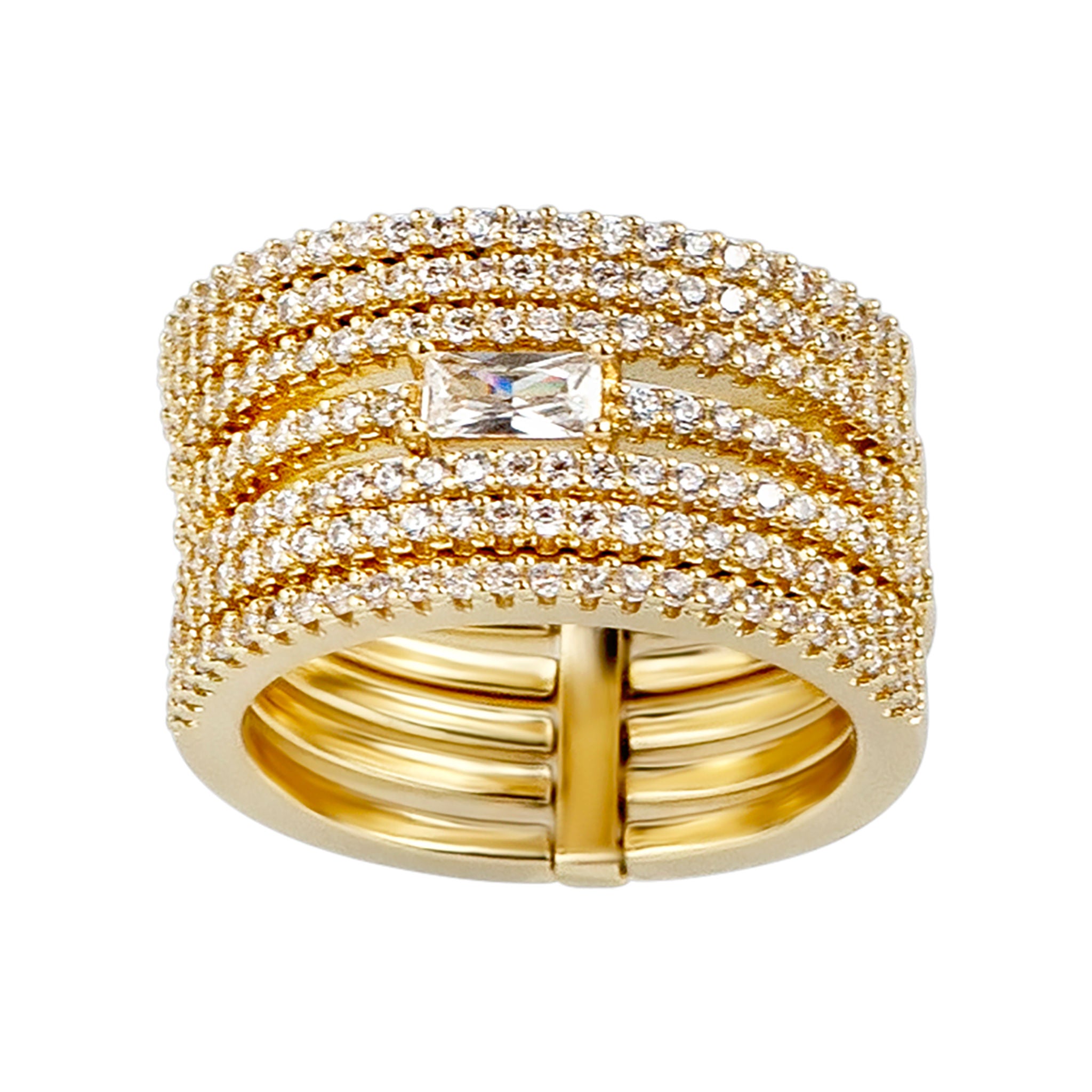The Semanario Ring - 14K Gold-Plated is an iconic piece that symbolizes prosperity and good fortune throughout the seven days of the week. Designed in the classic semanario style, this ring features the effect of 7 stacked bands in one elegant piece, offering modern style with a comfortable fit. Each band is pavé-set with sparkling cubic zirconia stones, and a center baguette-cut stone adds a luxurious statement. Crafted with a durable metal base and finished in 14K gold plating, this ring is perfect for those who love shine, symbolism, and bold elegance.